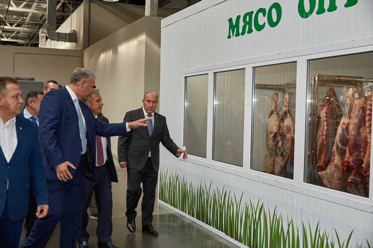 Комплексның төп бинасында “Казан” агросәнәгать паркы генераль директоры Олег Власов сату предприятиесендәге яңа эш юнәлешләрен тәкъдим итте. Республика Президенты комплекста тормышка ашырылучы күпләп сатуның бер юнәлеше – Татарстанда җитештерелгән ит сату белән танышты.