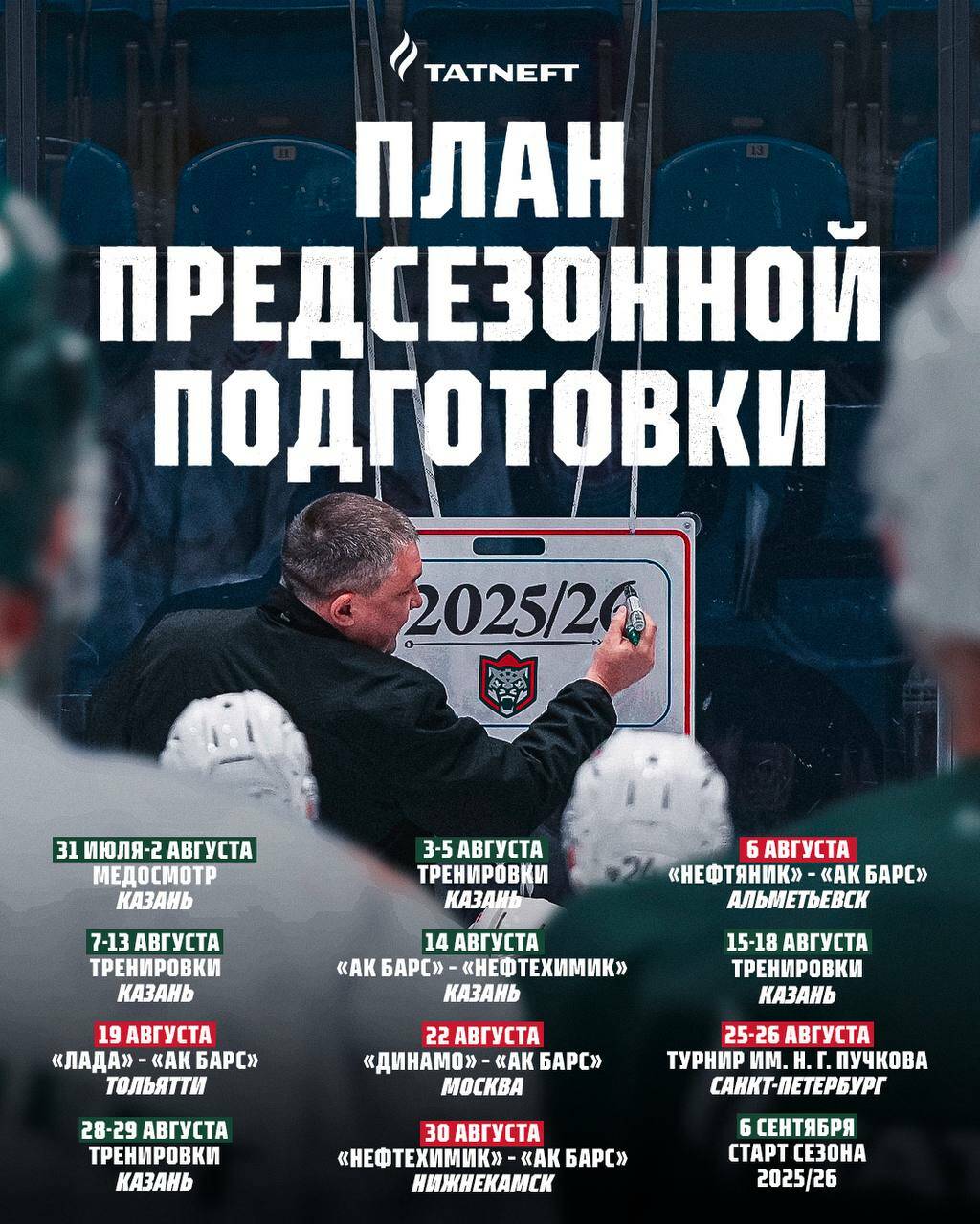 КХЛның 2025/26 сезонын «Ак Барс» 6 сентябрьдә Металлург Магнитогорск хоккей командасына каршы уен белән башлап җибәрәчәк.
