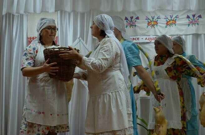 Югары Акхуҗа клубы сәхнәсе элекке авыл өен хәтерләтеп бизәлгән. Бер төркем кызлар каз өмәсенә җыелдылар. Аларның барысы да үз рольләренә бик тиз кереп киттеләр, шуңа да бу тамаша ардырмый-зарыктырмый барды. Уен-көлке, мәзәкләр сөйли-сөйли казларны йолкыгач, чишмәгә барып юып та кайттылар. Җыр-биюләре белән кабат сокландырдылар. Халкыбызның никадәр уеннарын тамашачыга җиткерделәр. Клуб мөдире, хуҗабикә ролен башкаручы Зөлфия Юзиеваның ул арада бәлеше дә пешеп өлгергән иде. Түбәгә су бөркү йоласы да үтәлде. Икенче елга казлар шул су тамчылары кадәр күп булсын өчен эшләнә икән ул. Милли киемнәрдән киенгән кызлар да берсеннән-берсе осталар. Тамашачылар өчен милли ризыклардан чәй табыны да хәзерләнгән иде. Һәркем бу чарадан канәгать калды.