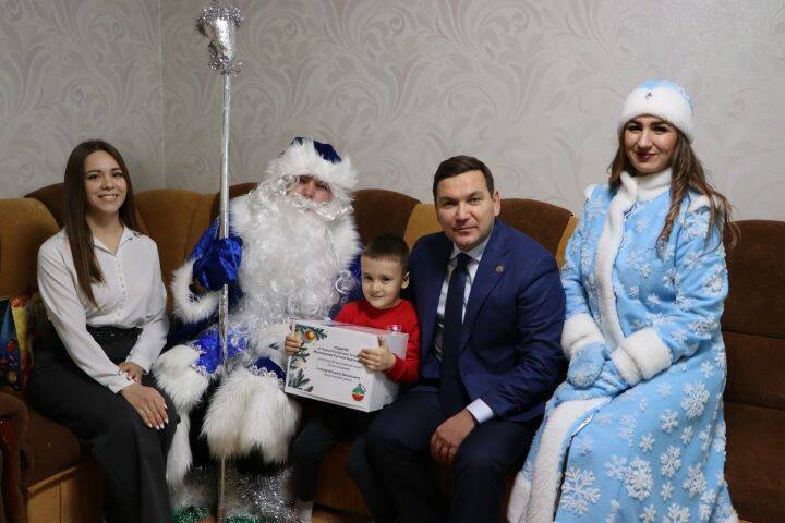 Бүләкне малайга бүген район башлыгы Айрат Җиһаншин Кыш бабай һәм Кар кызы белән бергә алып килгән.