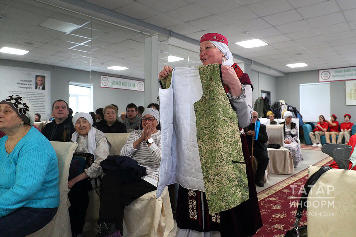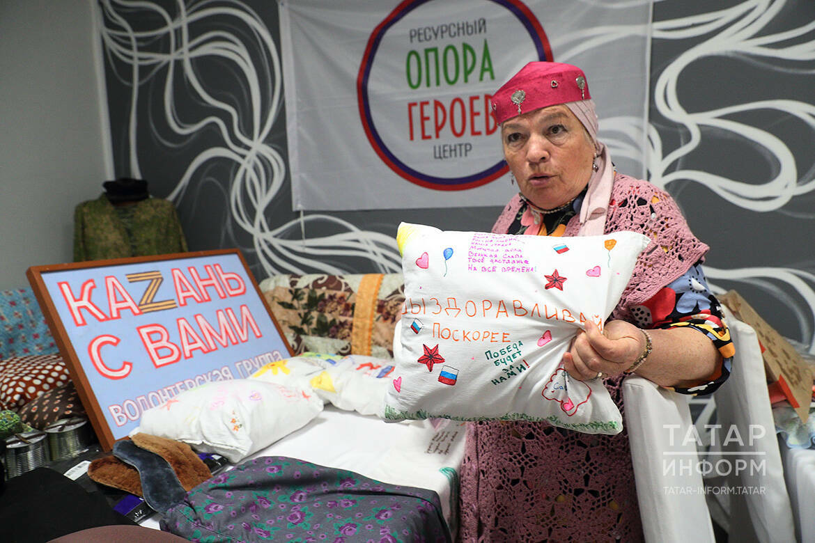 Рузалия Мостафина төрле кешеләрдән, инвалидлар җәмгыятеннән җыелган тукымалардан фронтка бик күп кием тегеп җибәргән, хәзер дә бу эшен дәвам итә. «Мин 2022 елның җәеннән Мәрҗани мәчетенә әйберләр алып килә башладым, аннары анда тегәргә материаллар күп булгач, алып кайтып, солдатларга эчке киемнәр тегәргә керештем. Тегеп китерәм дә, тагын тукымалар алып кайтам. Атнасына ике тапкыр мәчеткә бара идем, шулай итеп, шушы эшкә тартылдым. Иптәшемнең төрле коралларын, ир-атларга яраклы төрле кирәк-яракларны да җыеп җибәрә идем. Без җибәргән машина өчен солдатлардан рәхмәт сүзләре ишетү бик рәхәт булды. Саклану министрлыгыныннан «Махсус хәрби операциягә ярдәм иткән өчен» дигән медаль бирделәр», – дип сөйләде ул «Татар-информ» хәбәрчесенә.
