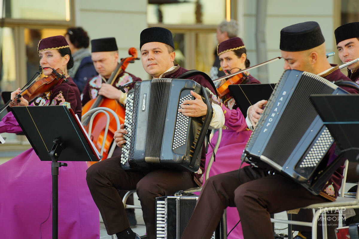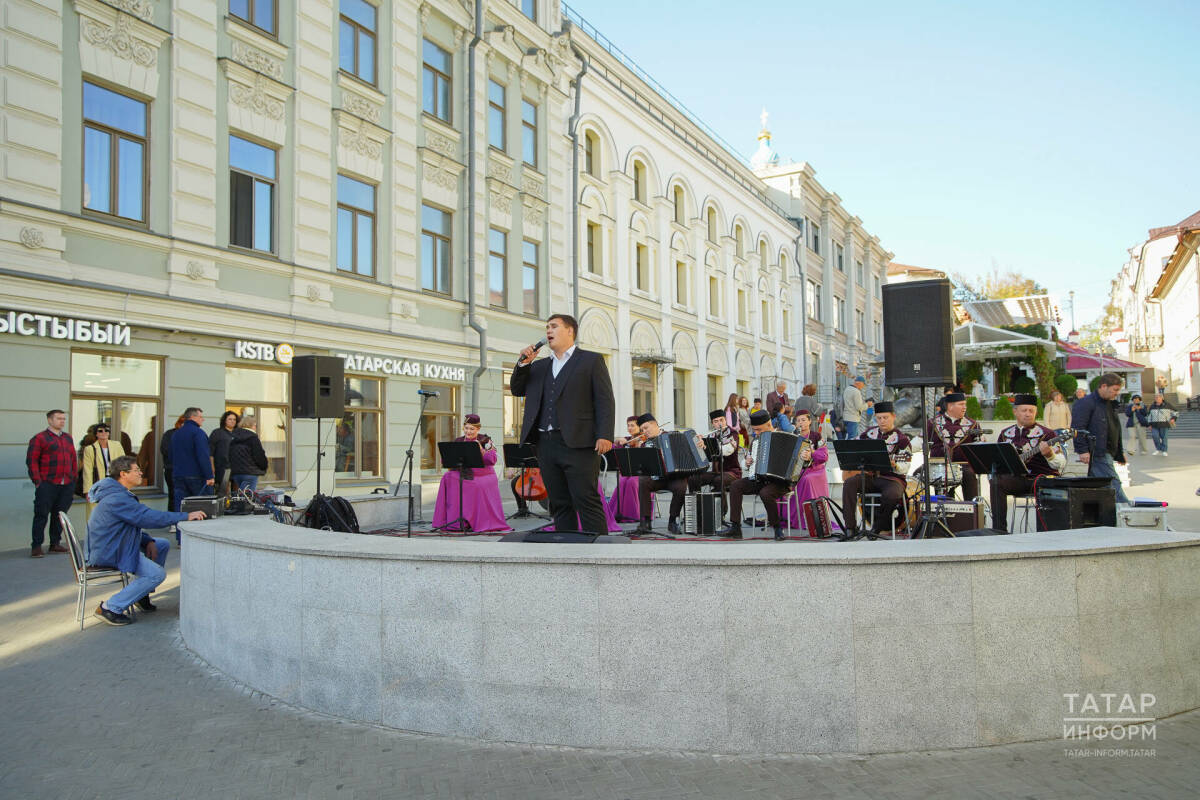 Татарстан Республикасы Дәүләт җыр һәм бию ансамбле оркестры Бауман урамында урнашкан Казан Мәчесе һәйкәле янындагы мәйданчыкта чыгыш ясады.