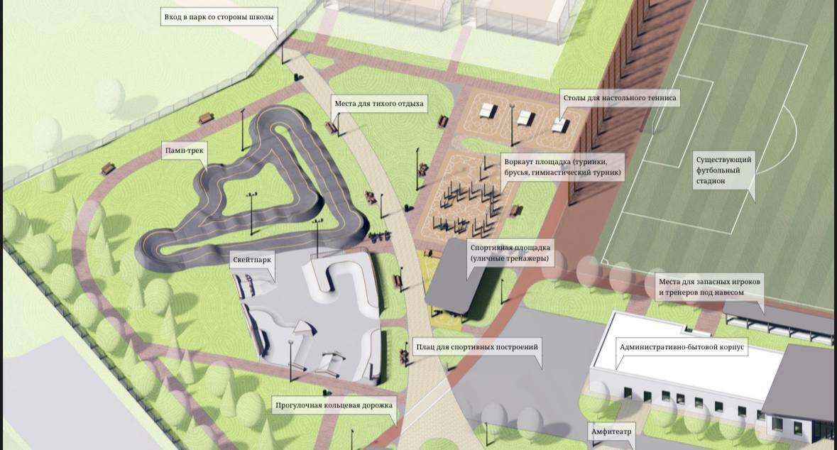 Балалар өчен яшь буенча бүленгән зур уен мәйданчыгы, ә яшүсмерләр һәм яшьләр өчен заманча скейт-парк һәм воркаут-зона булдырылачак.