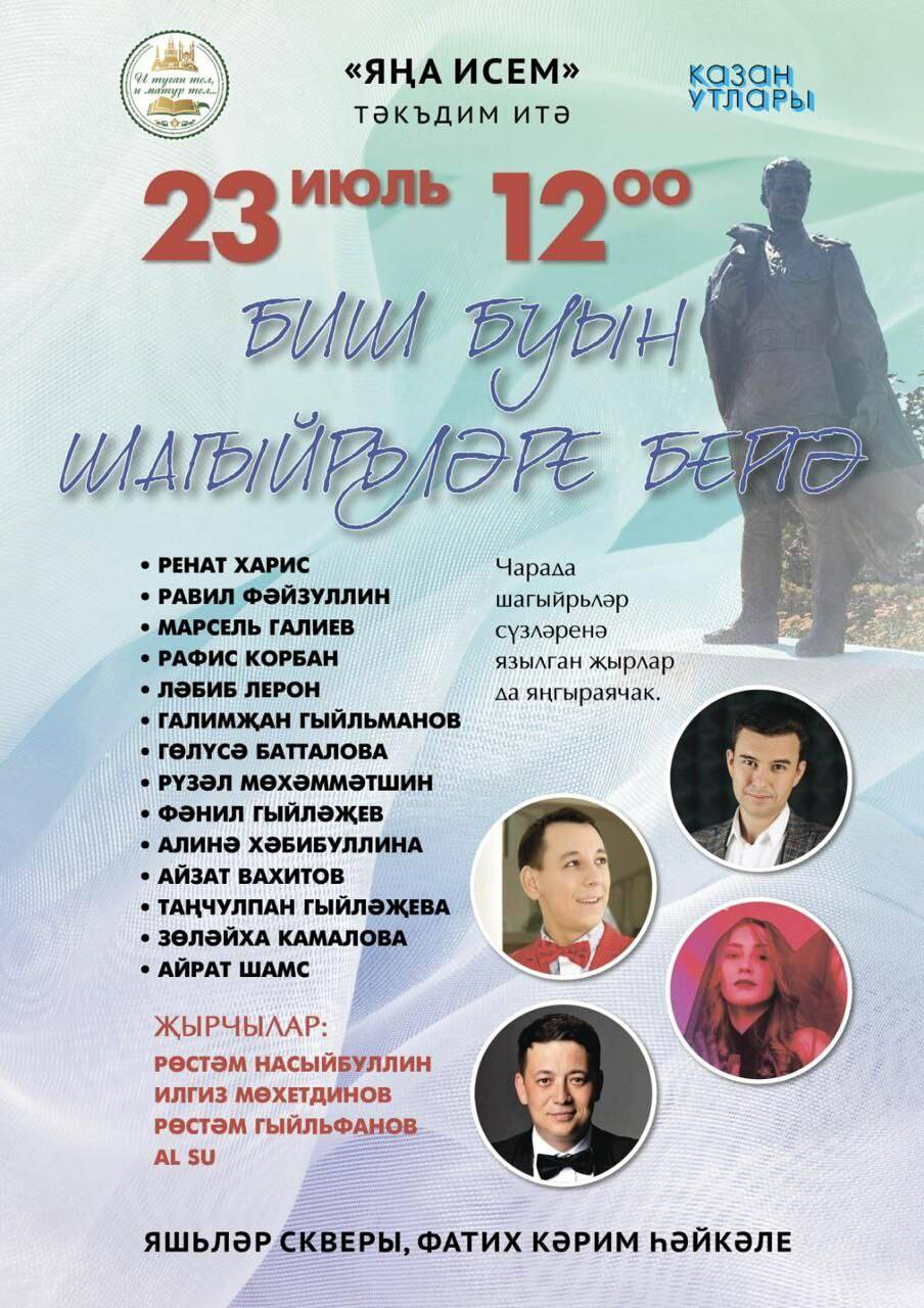 23 июльдә 12.00 сәгатьтә «Яңа исем» әдәби лабораториясе Казандагы Фатих Кәрим һәйкәле янында «Биш буын шагыйрьләре бергә» дип исемләнгән әдәби чара оештыра. Яшь иҗатчылар фронтовик шагыйрь Фатих Кәрим әсәрләреннән шигъри перформанс тәкъдим итә.