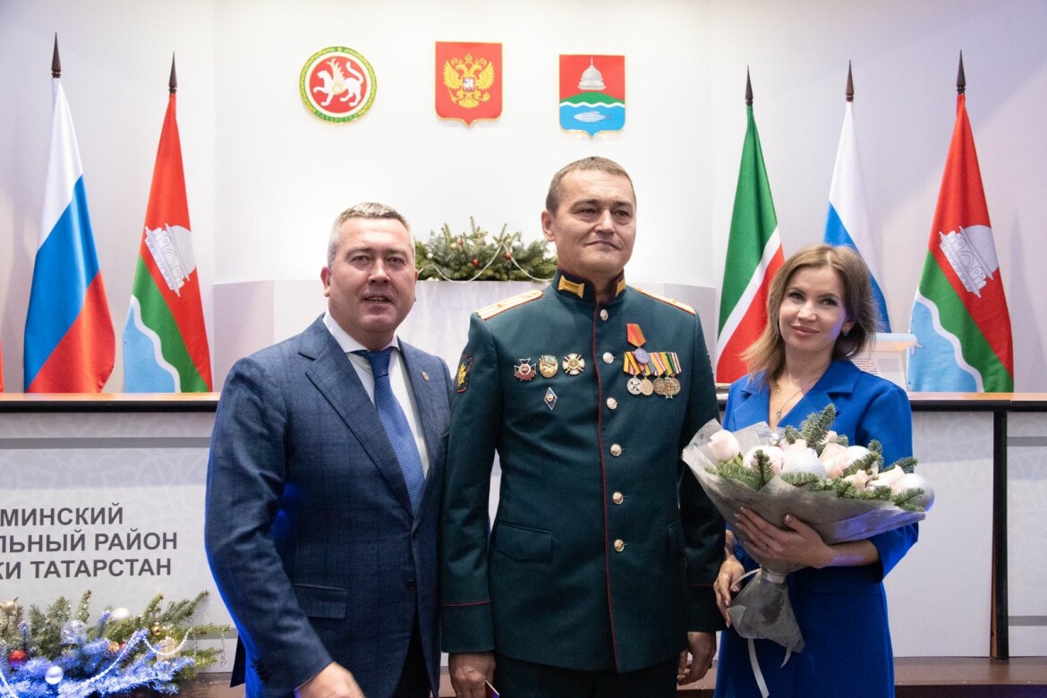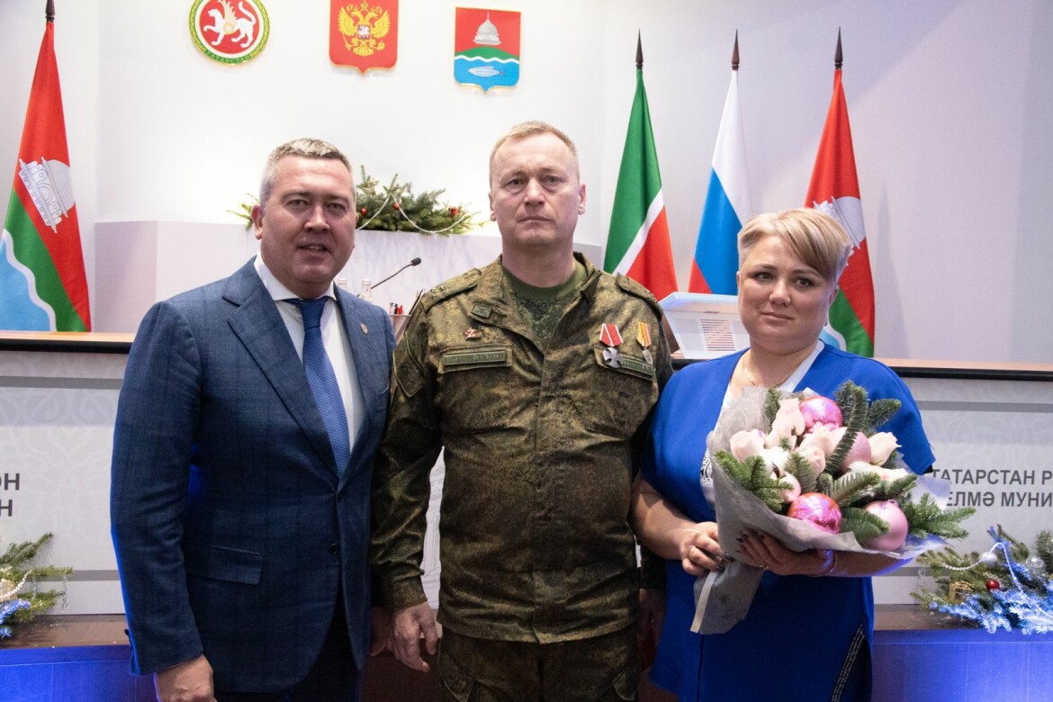 Бүген эшлекле дүшәмбе йомгаклау киңәшмәсендә Татарстанның Бөгелмә районы башлыгы Линар Закиров өлкән лейтенант Альберт Әхмәтшинга «Батырлык» ордены тапшырды. Аның бертуган абыйсы Эдуард Әхмәтшин түшенә исә «Жуков» медален такты.