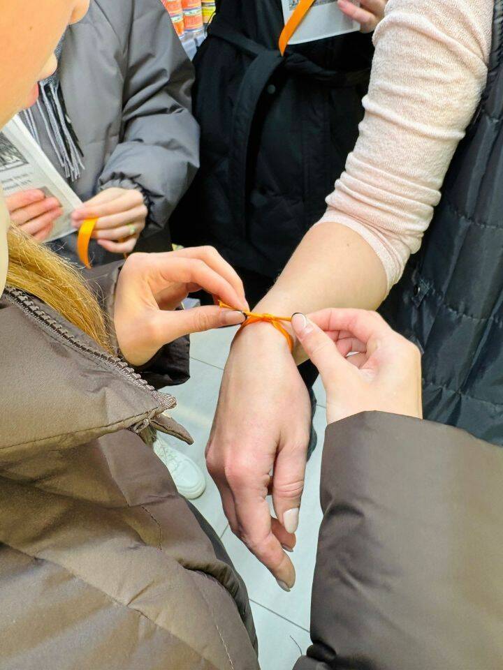Акциядә катнашучыларның кулларына кояш, шатлык, иҗади энергия һәм нәсел дәвамы символы булган кызгылт-сары тасмалар бәйләгәннәр.