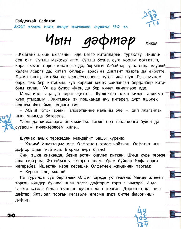 «Балачак әдипләре» сәхифәсендә дә яңалык бар. Элек журналда хикәя, әкиятләр кыскартылып бирелә иде. Май санында басылган хикәяне исә тулы вариантта аудиоязма итеп тыңларга да мөмкин. Гәбдехәй Сабитовның «Чын дәфтәр» хикәясен танылган җырчы, алып баручы Рафил Җәләлиев укый. Бу тәҗрибәне алга таба да дәвам итәчәк.