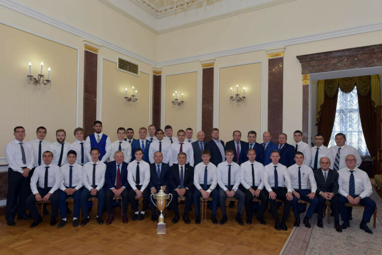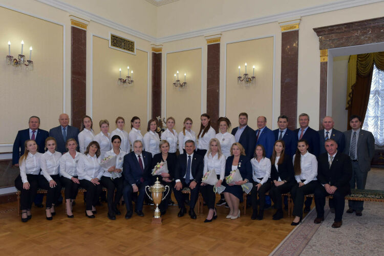 Команда капитаны Ирина Осипова Татарстан Президентына бүләк итеп, Россиянең яңа чемпионнары төшкән гомуми фото һәм озак көтелгән җиңүне китергән кәшәкәләрнең берсен бүләк итте.