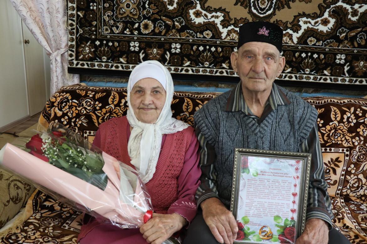 Бриллиант һәм тимер туйларын билгеләп үтүче мөхтәрәм парларны өйләренә барып, район Башкарма комитеты җитәкчесе урынбасары Айрат Җәлалов, ЗАГС бүлеге җитәкчесе Альбина Шәрәфетдинова һәм авыл җирлекләре башлыклары котлады. Хөрмәтле гаилә парларына район башлыгы исеменнән котлау хатлары, бүләкләр тапшырылды.