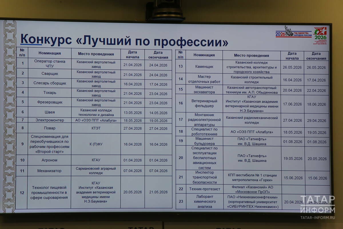 «Агрономнар һәм механизаторлар арасында бәйгеләр узды инде. 16 апрельдә, Бөтенроссия ярминкәсе алдыннан, «Һөнәре буенча иң яхшысы» конкурсының өч төбәк этабы узачак: вертолет заводы базасында - слесарь-җыючылар, төзелеш көллиятендә - бизәкләү эшләре осталары арасында. Махсус хәрби операциядә катнашучылар өчен аерым махсус номинация - «Икенче старт» - оештырылачак», – диде ул.