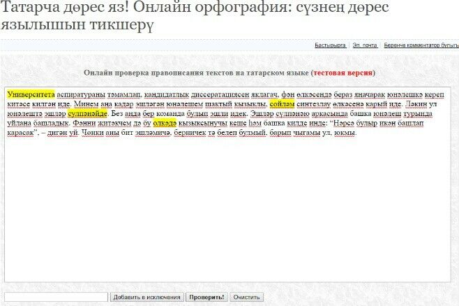 Моның өчен хаталы текстны тәрәзәгә урнаштырып, "проверить" төймәсенә басарга кирәк. Хаталы текстлар сары төс белән күрсәтелә.