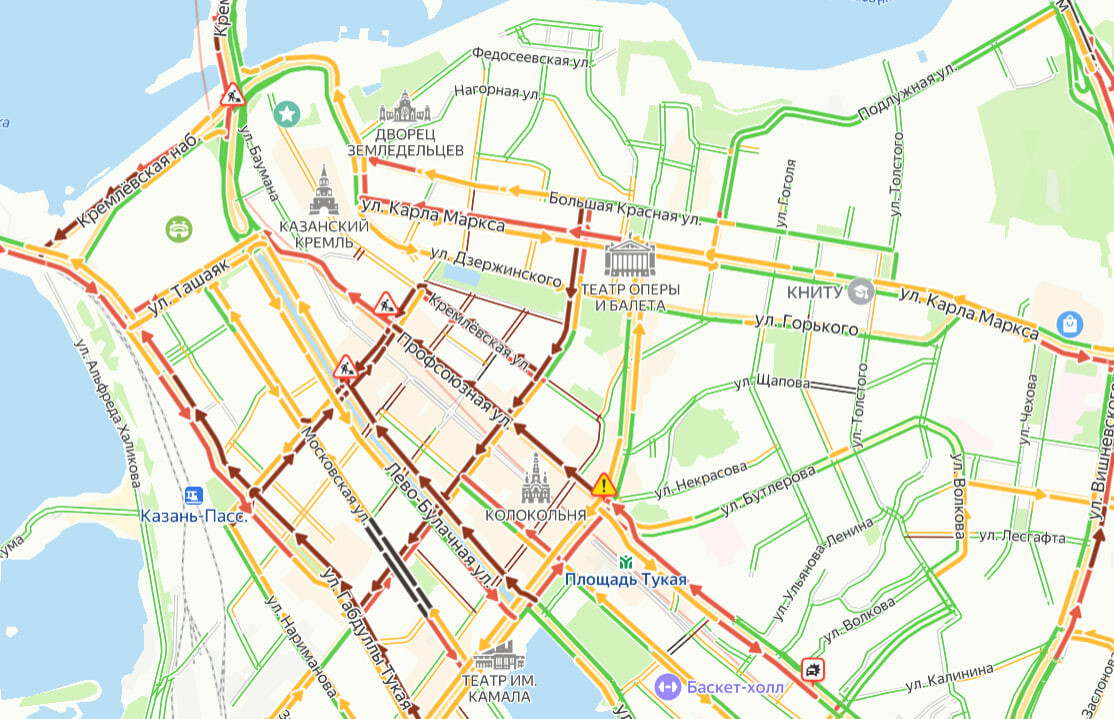 Казан үзәгендә Җиңү парады репетициясен үткәрү өчен кирәкле киртәләр аркасында зур «бөке» барлыкка килде. Барлык урамнарда да хәрәкәт авырайды.