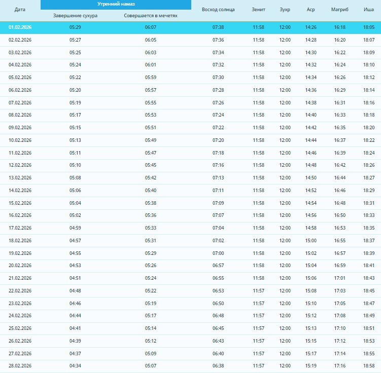 Казанда февральгә намаз, сәхәр һәм ифтар вакытлары