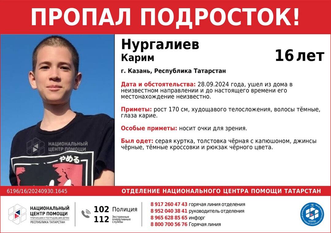 Казанда 16 яшьлек яшүсмерне эзлиләр. Узган шимбәдә яшүсмер өйдән билгесез юнәлештә чыгып киткән, әлегә кадәр аның кайда булуы билгесез. Бу хакта «Татар-информ»га Татарстан Югалган һәм зыян күргән балаларга ярдәм итү илкүләми үзәге бүлегендә хәбәр иттеләр.