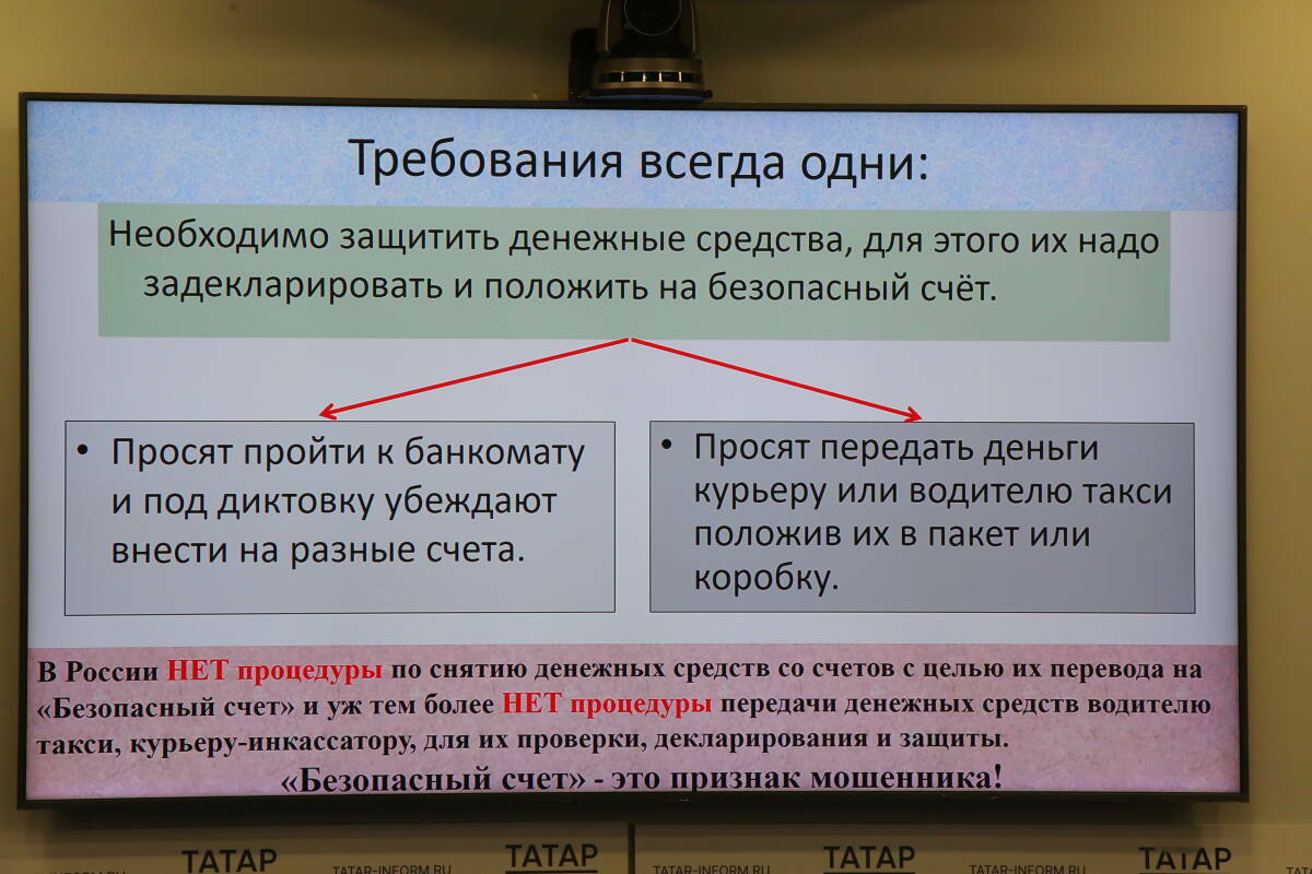 «Мошенниклар йогынтысында кеше үзе банкоматка бара, барлык акчаларын ала, кредитлар рәсмиләштерә һәм акчаларны курьерга тапшыра. Мошенниклар моны «акчаларны куркынычсыз счетка күчерер өчен кирәк» дип аңлата. Исегездә тотыгыз: «куркынычсыз счет» терминын мошенниклар уйлап тапкан, чынлыкта андый төшенчә юк», - дип аңлатты ул.