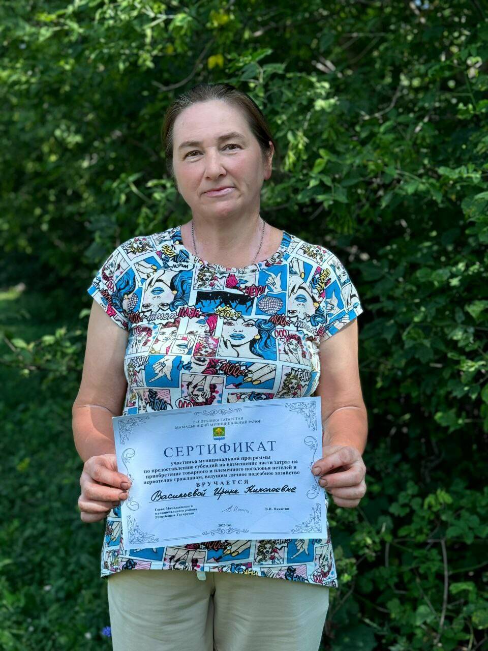 «Район җитәкчелегенә рәхмәт! Ирем вафат булгач, хуҗалык тоту авырлашты, һәм мин барысын да сатарга мәҗбүр булдым. Ә аннары аңладым, мал-туардан башка яши алмыйм, хуҗалыкны яңадан тергезергә туры килде. 2023 елда республика программасыннан файда күргән идем. Ә хәзер муниципалитет та ярдәм итте» — дип уртаклашты Ирина Васильева.