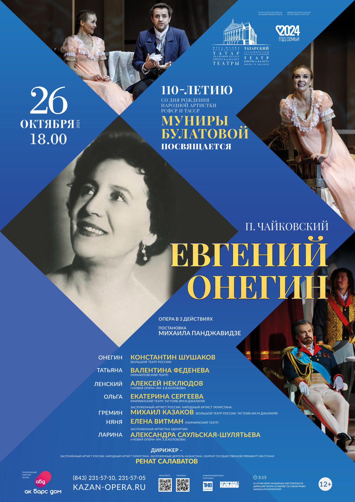 «26 октябрьдә Муса Җәлил исемендәге Татар академия дәүләт опера һәм балет театрында П.И.Чайковскийның «Евгений Онегин» операсы башкарыла. Спектакль РСФСР һәм ТАССРның халык артисты Мөнирә Булатова (1914-2011) 110 истәлегенә багышлана», дип хәбәр итә тетарның матбугат үзәге.
