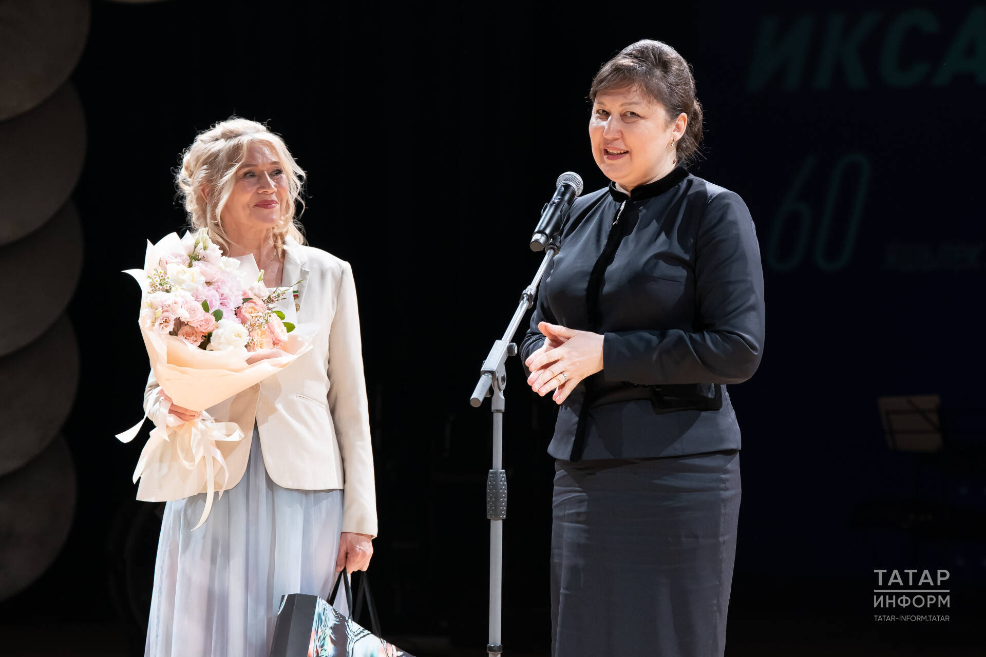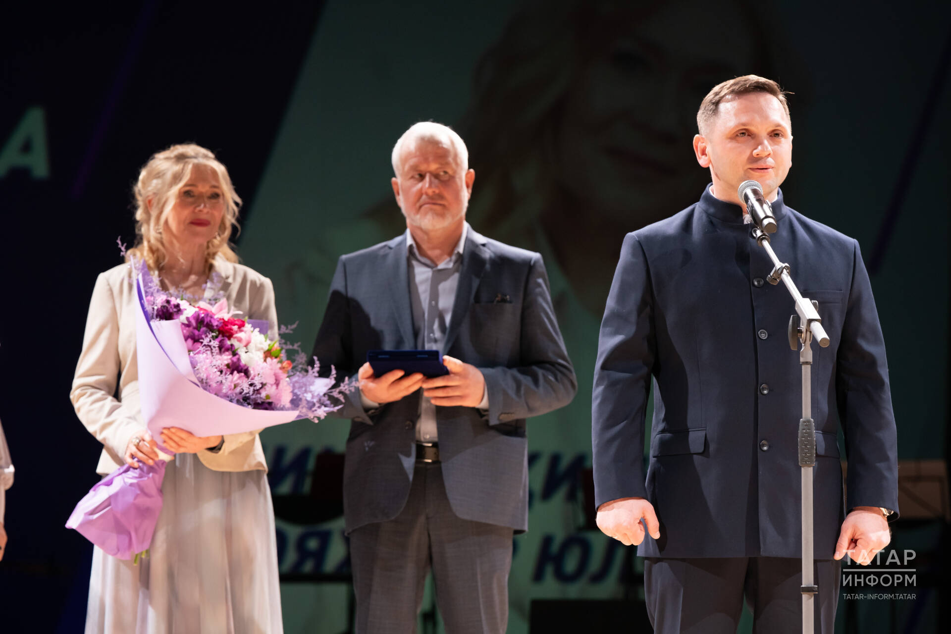 Татарстан Рәисе карамагындагы мәдәниятне үстерүгә ярдәм фонды башкарма директоры Нурия Хашимова тамашачыларны һәм юбилярны Татарстан Рәисе Администрациясе җитәкчесе Әсгать Сәфәров исеменнән сәламләде.