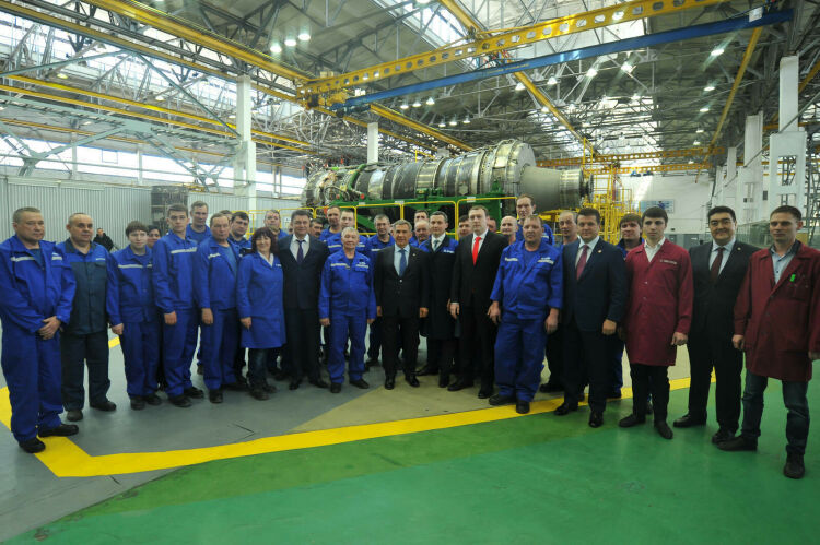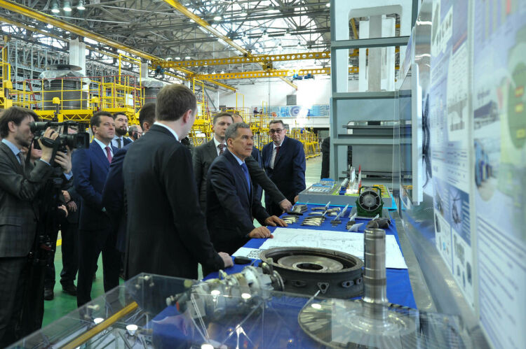 Республика лидеры Казан моторлар төзелеше җитештерү берләшмәсе цехларын карады. Рөстәм Миңнехановка газ турбиналары җайланмаларын җитештерү барышын күрсәттеләр һәм инновацияләрне куллану турында сөйләделәр.