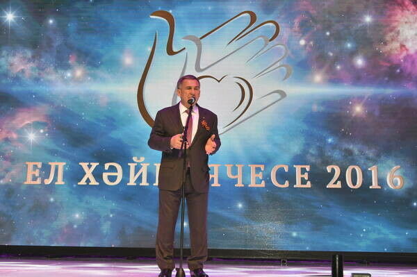 "Мин, Сезгә мөрәҗәгать итеп, Минтимер Шәрипович, котларга телим", – диде "Ел хәйриячесе-2016" республика бәйгесенең җиңүчеләрне бүләкләү тантанасында Рөстәм Миңнеханов.