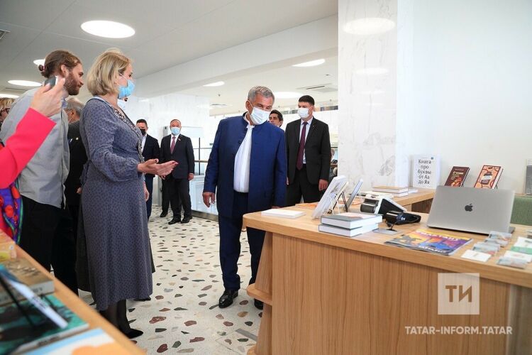 Рөстәм Миңнехановка китап бирү һәм тапшыруның автоматлаштырылган системасы турында сөйләделәр. Китапханә ябык вакытта да теләсә кайчан килеп китап тапшырып булырлык җайланма куелган. Барлык кунакларга Габдулла Тукай китаплары, Россиянең төрле шәһәрләрендә 20 гасыр башында гарәп графикасында басылган татар газеталарын күрсәттеләр. Мәсәлән, «Тавыш», «Тормыш», «Фикер», «Таң», «Кызыл Армия», «Азат халык», «Әл-ислах» газеталары. Рәсми затлар элекке бинаның музей чагын хәтерләтеп торган скульптура фонында фотога төштеләр.