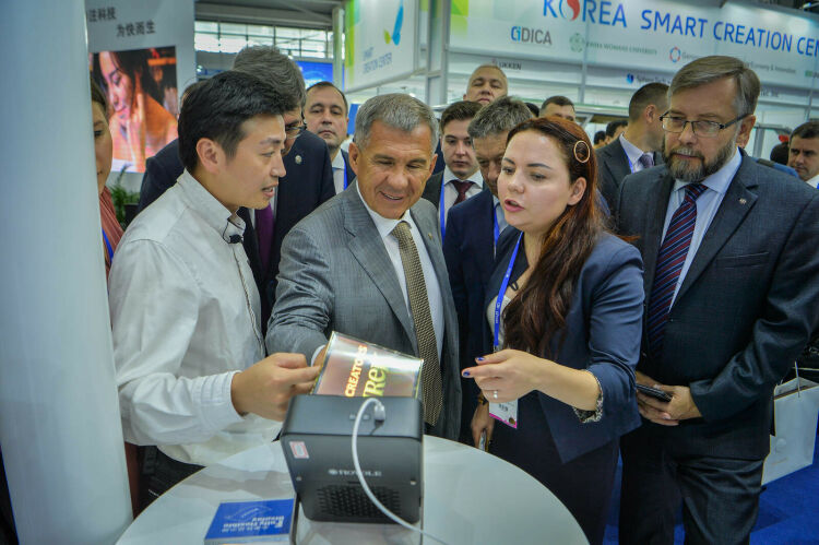 Рөстәм Миңнеханов күргәзмә павильоннарында ясалма акыл, авиация, космонавтика, биотехнология, энергияне сак тоту, электроника, әйләнә-тирә мохитне саклау өлкәсендәге бөтендөнья эшләнмәләре белән танышты.