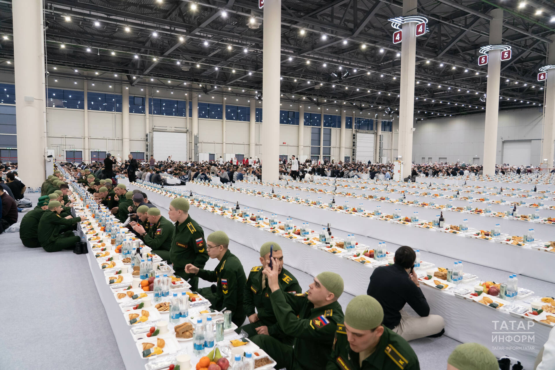 Авыз ачар вакыт җиткәч, яшь җырчы Рөстәм Хөсәенов азан әйтте, һәм Татарстан мөфтие җитәкчелегендә барча халык ахшам намазын укыды. Аннан соң ир-атлар һәм хатын-кызлар аерым коридорлар аша ифтар залларына узды. Шуны билгеләп узарга кирәк: ни кызганыч, алдагы елларда ифтар вакыты җиткәч, өстәлләр янына ашыгып, әйткәләшеп, этешеп-төртешеп бару кебек күңелсез күренешләр дә була иде. Аеруча хатын-кызларның шулай ямьсезләнүе дә сер түгел. Өстәлләрдә калган ризыкларны комсызланып җыючыларны тәнкыйтьләүчеләр дә булды. Шул сәбәпледер, Илфар хәзрәт ифтар башланганчы залда микрофоннан «әдәп, әхлак, тәртип булсын» дип кат-кат кабатлады.