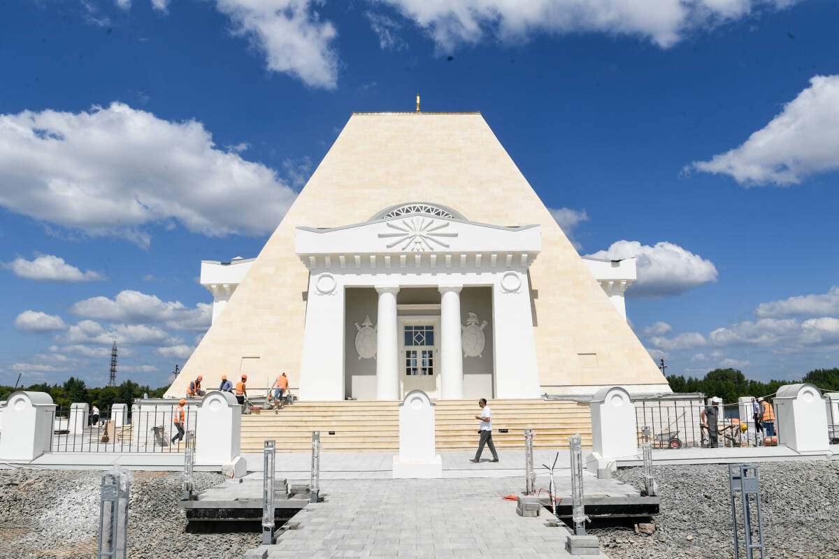 Гыйбадәтханә-һәйкәлне карау барышында Рөстәм Миңнехановка эчке бизәү эшләре, керү урыннарын, баскычларны, портларны һәм әвәләп ясалган бизәлешне торгызу процессы соңгы стадиядә булуын хәбәр иттеләр. Фасадны табигый таш белән тышлау, тарихи причал баскычын кору, түбәне реставрацияләү, һәйкәл территориясе периметры буйлап таш киртә урнаштыру тәмамлана. Тирә-яндагы территорияне төзекләндерү эшләре дәвам итә.