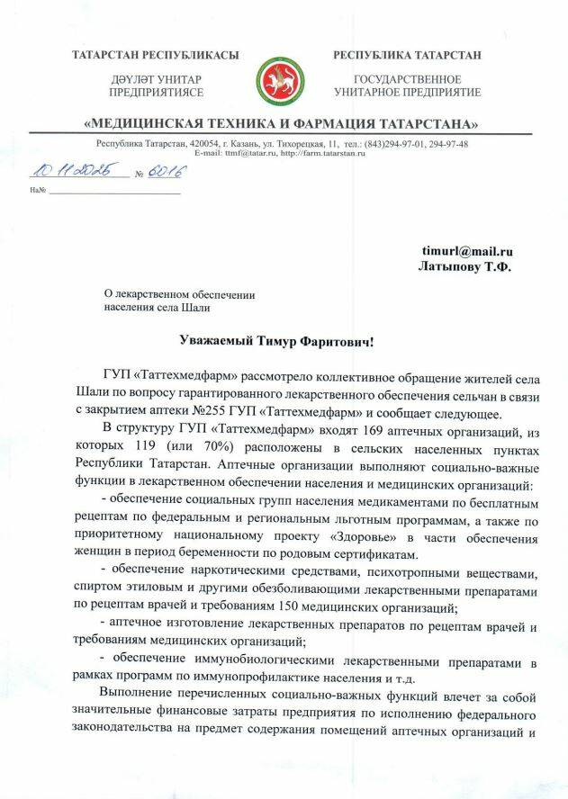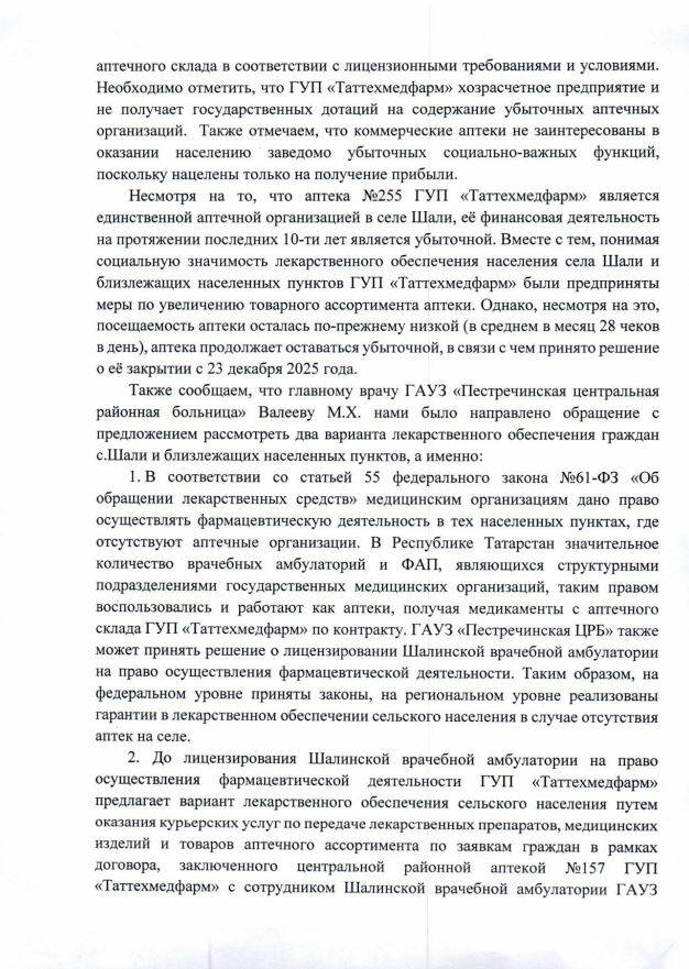 Питрәч районының 3 мең кеше яшәүче Шәле авылында «Таттехмедфарм» дәүләт унитар предприятиесенең даруханәсен ябарга җыеналар. «Таттехмедфарм» авыл халкына биргән рәсми җавапта, Шәле даруханәсенең 10 елга якын финанс яктан табышсыз булуы билгеләнә. Аннары медикаментлар ассортиментын арттырсалар да, ихтыяҗ булмаганын язалар. Даруханә эшен быел 25 декабрьдә туктатылачагы билгеле булды. Авыл халкы исеменнән «Татар-информ»га урындагы мәчетнең имамы Тимур хәзрәт Латыйпов мөрәҗәгать итте һәм әлеге социаль әһәмияттәге объектның авылдашлары өчен никадәр мөһим булуын аңлатты.
