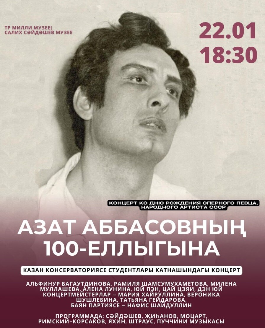 Иртәгә 18.30 сәгатьтә Татарстанның Милли музее филиалы – Салих Сәйдәшев музеенда 1950-1990 елларда Муса Җәлил исемендәге Татар дәүләт опера һәм балет театры солисты булган, СССРның халык артисты Азат Аббасовның 100 еллыгына багышланган классик музыка концерты була.