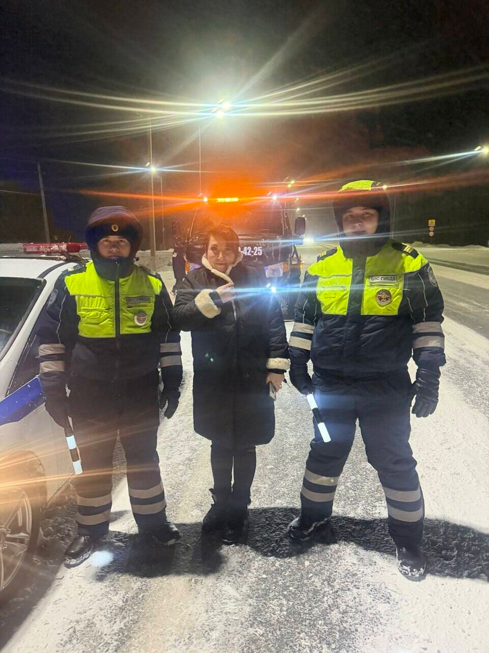 Инспекторлар хатын-кызга патруль автомобилендә җылынырга тәкъдим иткән һәм машинаның техник төзексезлеген оператив рәвештә төзәтергә булышкан.