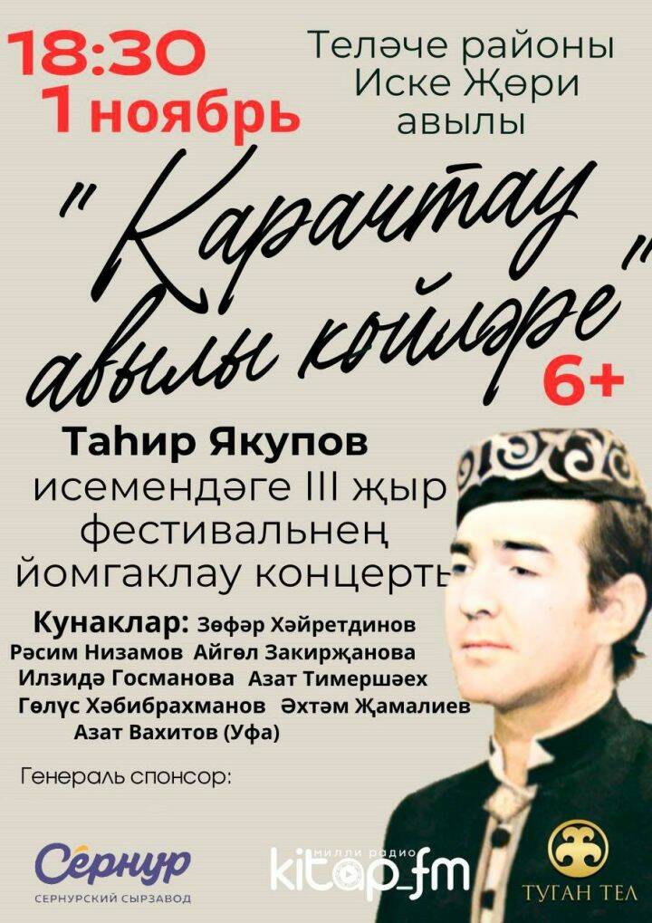 1 ноябрьдә Теләче районы Иске Җөри авлында Таһир Якупов исемендәге «Карачтау авылы көйләре» III җыр фестиваленең йомгаклау концерты була. Бу хакта https://saba-rt.ru/ сайтында хәбәр ителә.