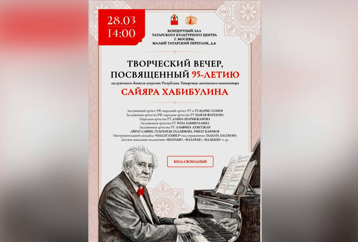 28 мартта Мәскәүдә танылган татар композиторы Сәйяр Хәбибуллинның 95 яшьлек юбилеена багышланган иҗат кичәсе була. Бу хакта Мәскәү шәһәре Татар милли-мәдәни автономиясе төбәк иҗтимагый оешмасы матбугат хезмәте хәбәр итә.