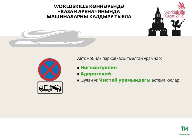 (Казан, 20 август, "Татар-информ"). WorldSkills стандартлары буенча эшче һөнәрләр чемпионатын ачу һәм ябу тантаналары узган көнне "Казан Арена" стадионы янында шәхси машиналарны калдырып булмаячак. Шулай ук бу чикләүләр Нигъмәтуллин һәм Адоратский урамнарына, Чистай урамындагы өстәмә юлларга да кагыла.