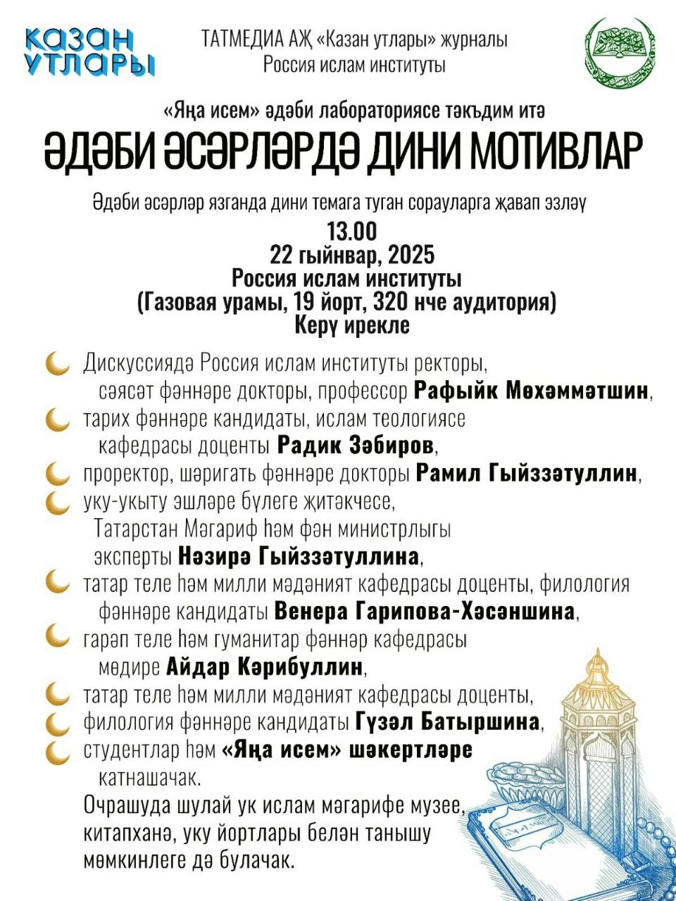 Бүген 13.00 сәгатьтә «Яңа исем» әдәби лабораториясе шәкертләре, студентлар, укытучылар Россия ислам институты белгечләре белән «Әдәби әсәрләрдә дини мотивлар» темасына фикер алышачак. Очрашуга керү ирекле.