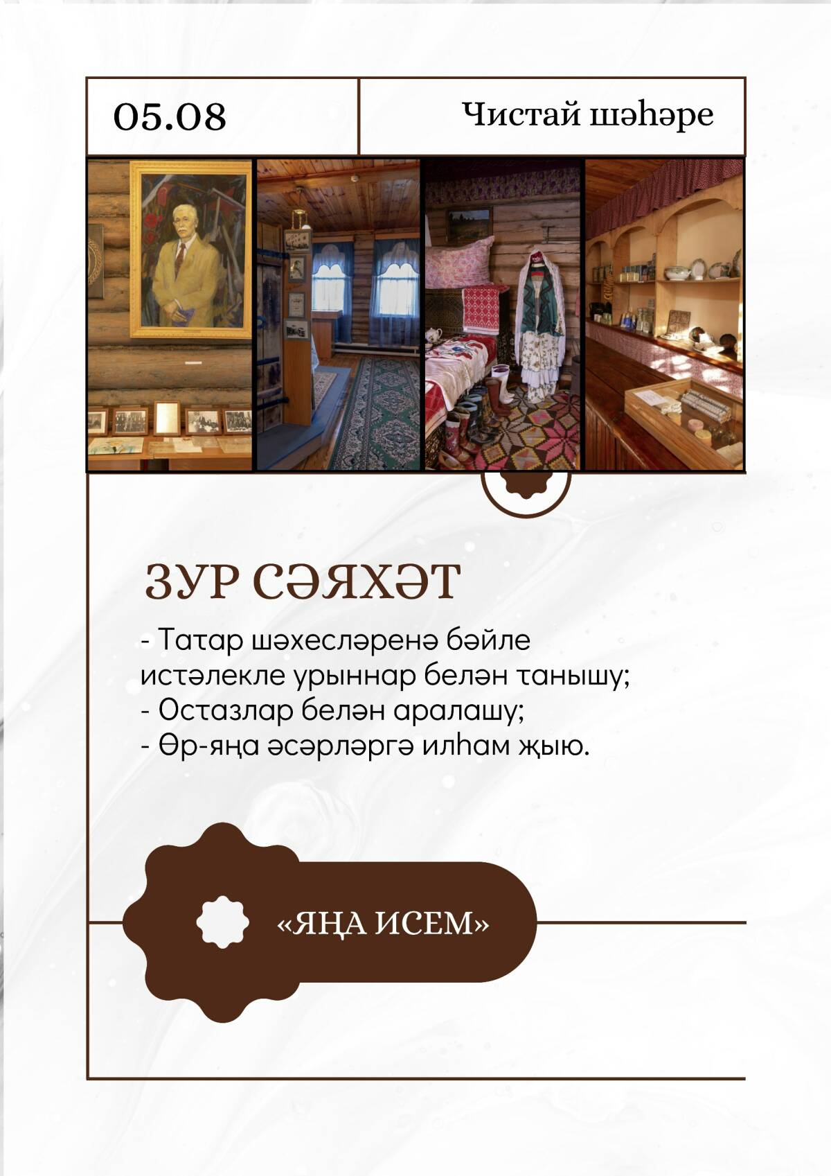 5 августта «Яңа исем» проектында катнашучылар Чистай шәһәренә сәфәргә бара. Бу хакта чараны оештыручылар хәбәр итә.