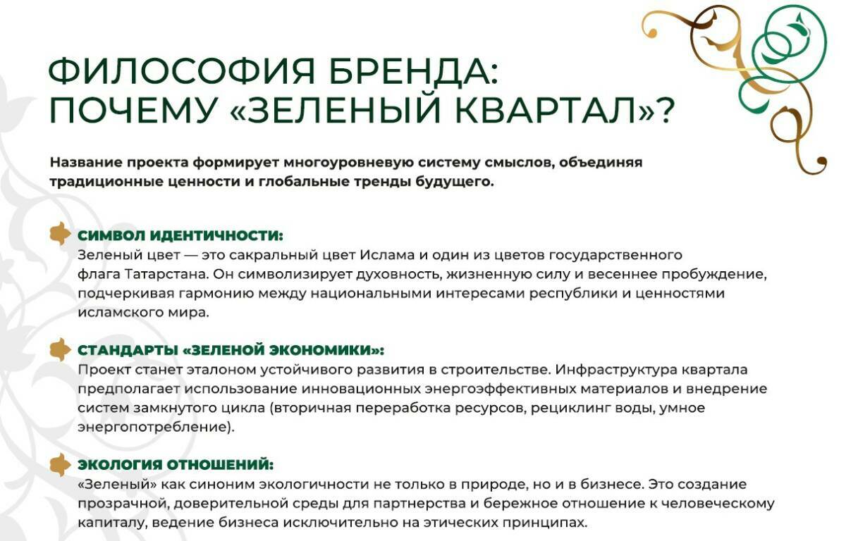 «Яшел квартал» атамасының берничә мәгънәсе бар. Беренчедән, исламда яшел изге төс санала. Икенчедән, проектны «яшел икътисад» стандартлары буенча тормышка ашырырга ниятлиләр. Өченчедән, «яшел» төшенчәсе бизнеста да экологик мәгънәгә ия.
